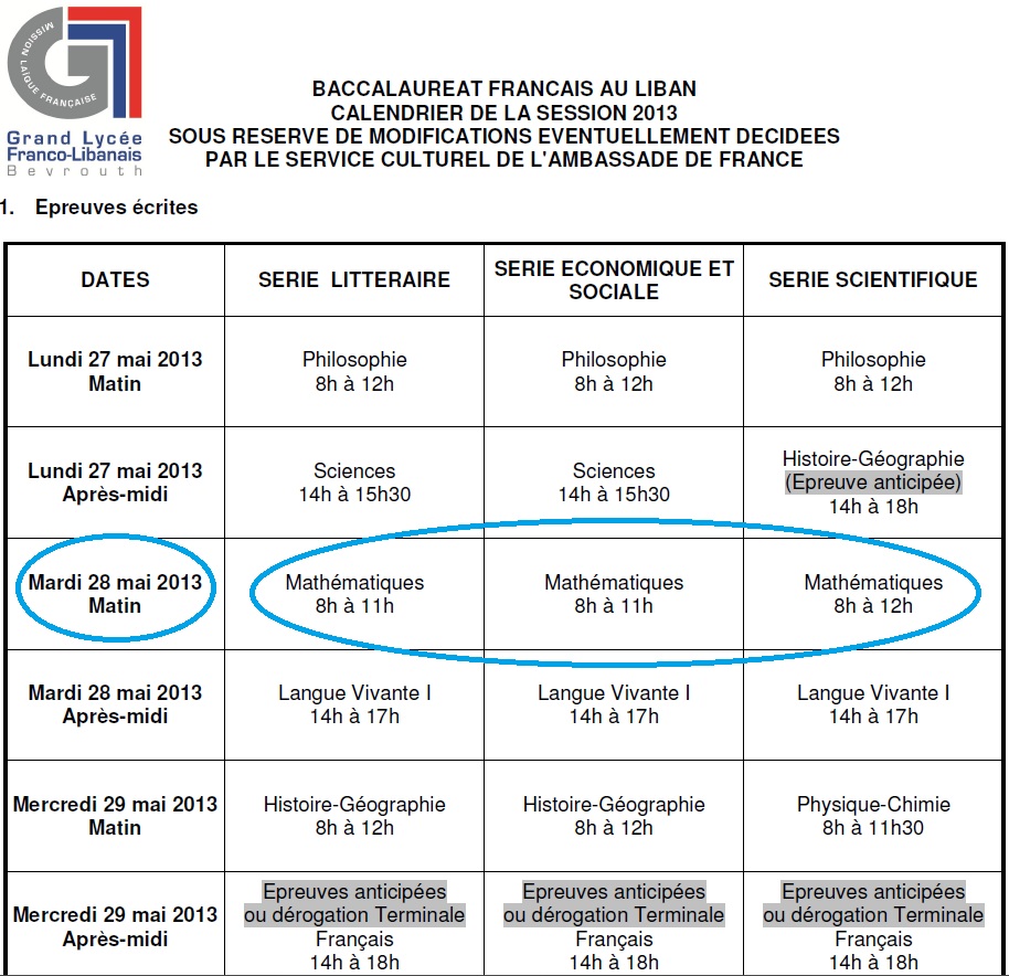 - Bac L 2013, Liban : Le mardi 28 mai 2013, Mathématiques de 8h à 11h.