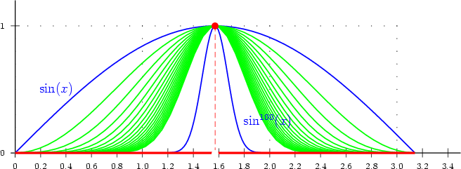 Les fonctions continues fn en vert définies par fn(x) = sinn(x) convergent vers la fonction discontinue f en rouge mais la convergence n'est pas uniforme.