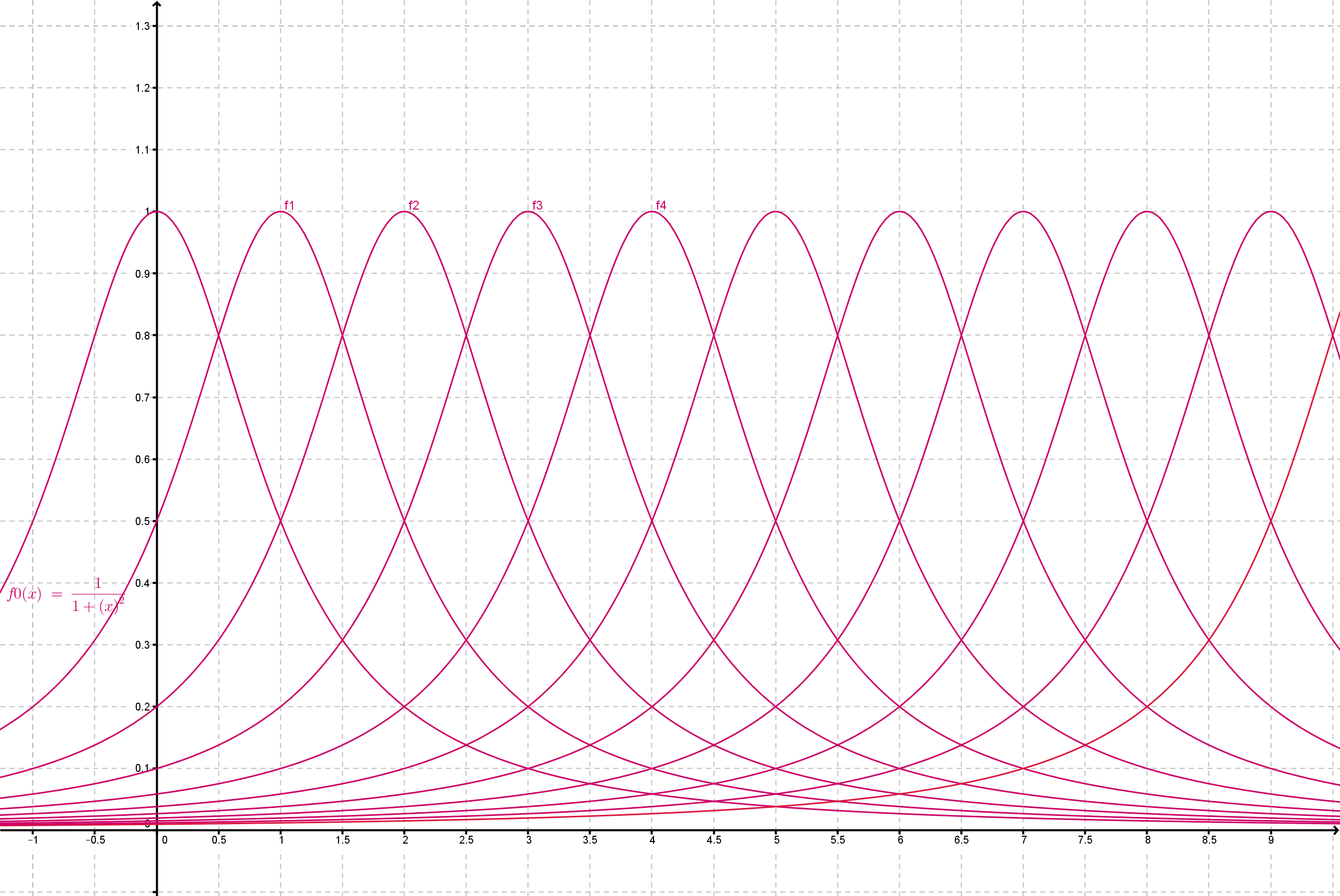 La convergence uniforme implique la convergence simple mais la réciproque est évidement fausse.- Contre-exemple : fn(x)=1/[1 + (x - n)²] [Hauch2]
