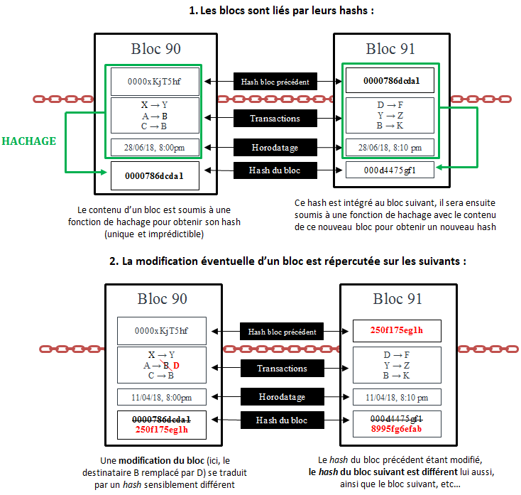 On l'a vu, un infime changement de la donnée en entrée (inversion d'un seul bit, par exemple) entraîne une perturbation importante de l'empreinte correspondante. Cette caractéristique des fonctions de hachage rend toute modification du contenu d'un bloc immédiatement visible dans les blocs suivants, même si cette modification est minime. En effet, le hash d'un bloc modifié est nécessairement très différent. Étant donné que ce nouveau hash est intégré au bloc suivant, son hash varie lui aussi. Comme l'indique le graphique ci-après, la modification d'une simple transaction au sein d'un bloc suffit à changer les hashs de tous les blocs suivants.