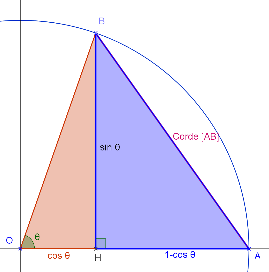 Dans le triangle BHA rectangle en H on a d'après le théorème de Pythagore : AB² = BH² + HA² = sin² θ + (1 - cos θ)²