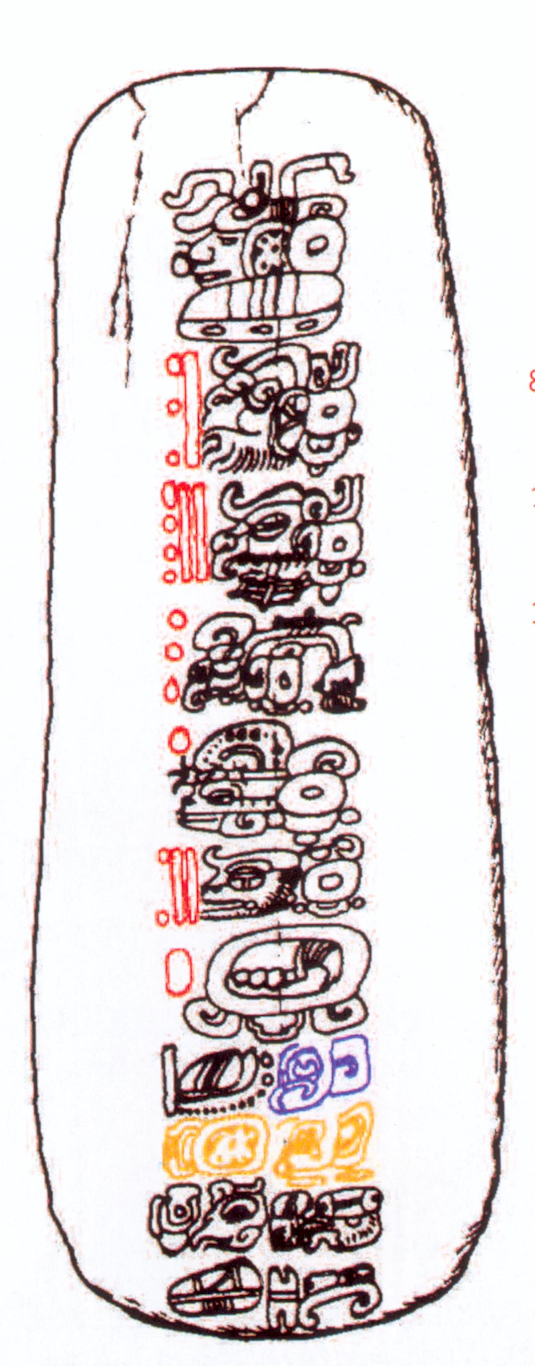 A son verso, après la durée "8 baktun 14 katun 3 tun 1 uinal 12 kin" et la date religieuse "1 Eb" (les nombres sont en rouge), on peut lire la date civile "0 Yaxkin" (le zéro en bleu et le mois en orange), qui serait la date d'accession au pouvoir d'un souverain. On voit aussi, sous le zéro ordinal, le glyphe de l'accession "il est monté sur le trône."