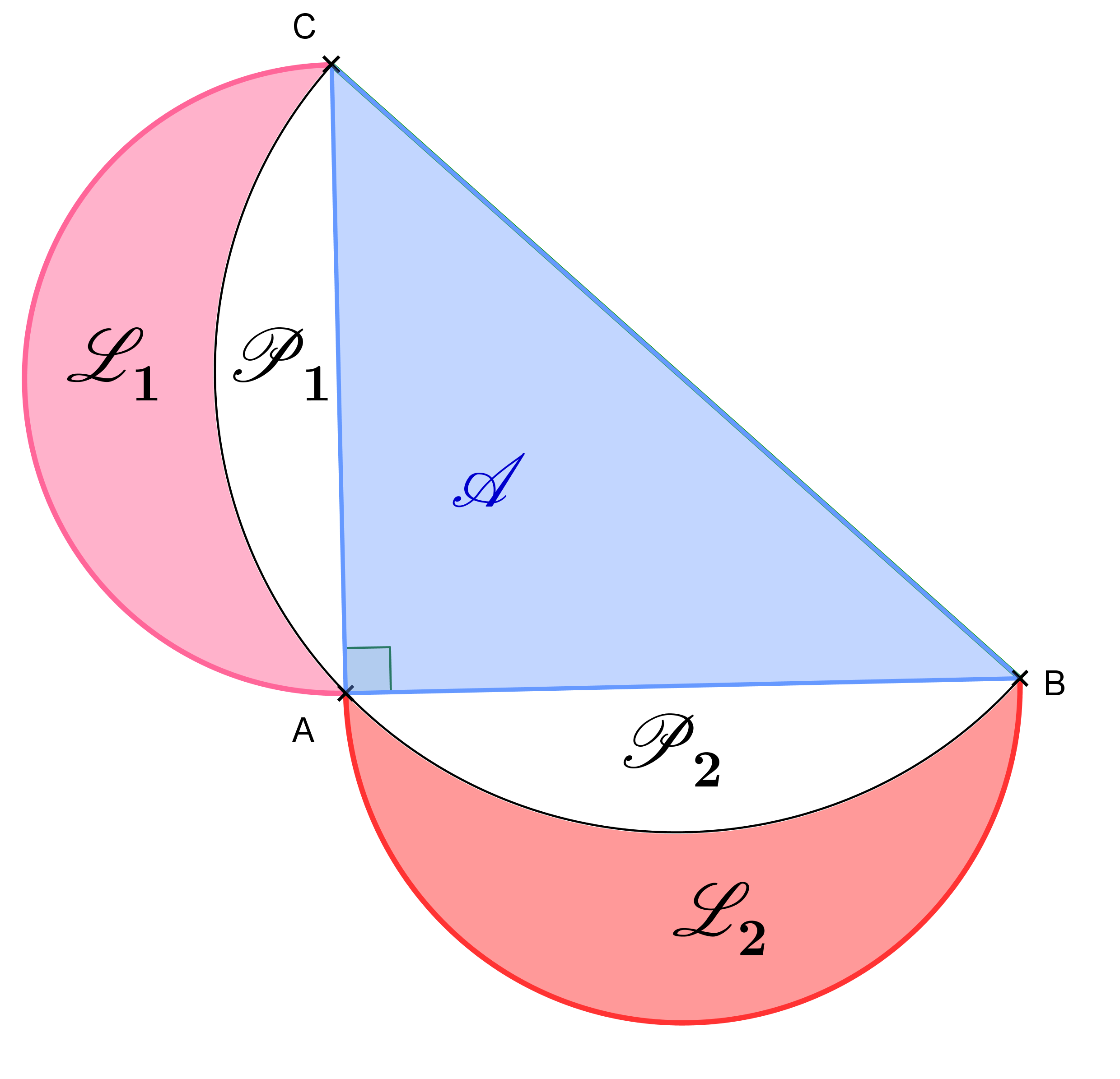 Notons Aire(ABC) l'aire du triangle ABC, P1 et P2 l'aire des partie blanches entre les lunules et les segments, et L1, L2 les aires des lunules.